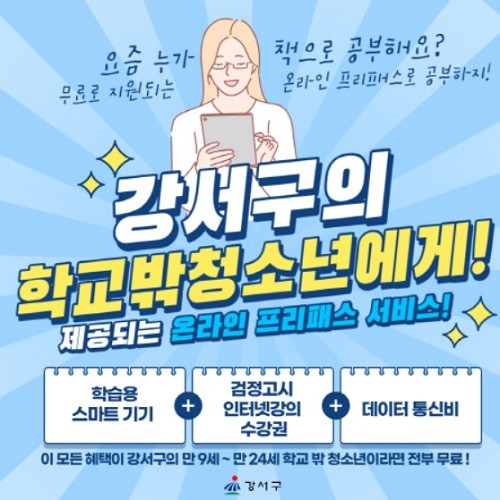 [열린의정뉴스 = 김진성 기자] 서울 강서구(구청장 노현송)는 학업 중단으로 어려움을 겪고 있는 청소년을 대상으로 '온라인 프리패스 학습 지원'을 추진한다고 밝혔다.