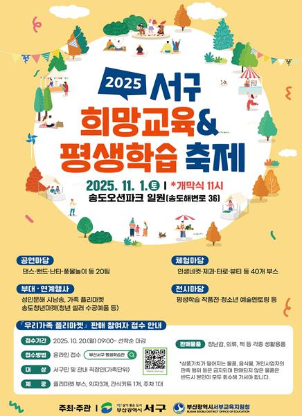[코리아 이슈저널=김태훈 기자] 부산 서구는 오는 11월 1일 송도오션파크에서 서부교육지원청과 공동으로 '2025년 서구 희망교육 & 평생학습 축제'를 개최한다.
