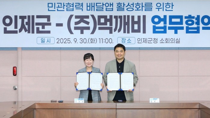 [코리아 이슈저널=최제구 기자] 인제군은 9월 30일 군청 소회의실에서 민관협력 배달앱 ‘먹깨비’ 운영사와 업무 협약을 체결하고, 지역 소상공인 경영 안정과 군민 편익 증진을 위한 본격적인 협력에 나섰다.
