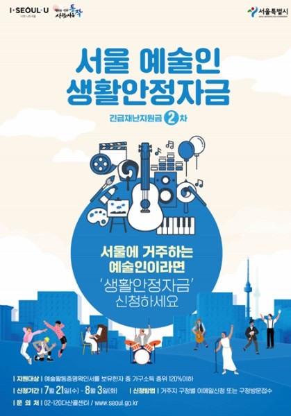 지원대상은 공고일 기준 관내 거주하는 주민 중 예술인활동 증명서를 보유한 가구소득 중위 120%이하 가구이며, 1차 서울 예술인 재난지원금 수혜자는 제외한다.
