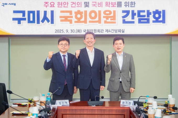[코리아 이슈저널=김태훈 기자] 구미시는 9월 30일 국회를 방문해 구자근, 강명구 지역구 국회의원과 간담회를 열고 지역 주요 현안과 국비 확보 전략을 논의했다. 이날 간담회에는 김장호 시장을 비롯해 구미시 주요 간부 공무원 등 30여 명이 참석했다. 시는 현안 사업 추진 상황과 정부 예산 동향을 공유하며 국회 차원의 전략적 지원 방안을 모색했다.