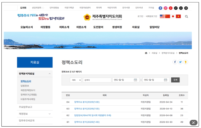 [코리아 이슈저널=김태훈 기자] 제주특별자치도의회는 입법 및 정책 동향 등 주요 현안에 대한 최신 정보를 도민에게 신속히 제공하기 위하여 '정책 소도리'를 운영하고 있다고 밝혔다.