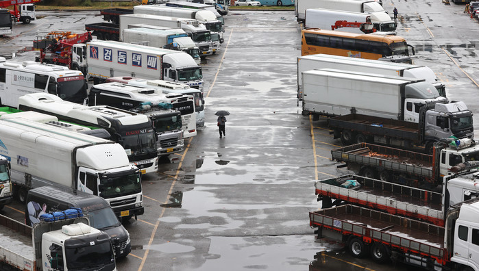 [열린의정뉴스 = 김윤영 기자] 8일 서울 양천구 서부화물터미널에서 주차된 화물차 사이로 관계자가 지나고 있다. 터미널 관계자는 요소수 품귀 등으로 터미널 주차장에 평소보다 많은 차량이 주차되어 있다고 전했다. 2021.11.8
