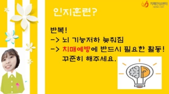 강좌 내용은 ▶단어 구성화 능력 ▶계산화 능력 ▶공간 구성화 및 순서화 능력과 관련된 치매 예방학습으로 구성됐으며, 5월 29일부터 4주간 매주 1편씩 학습을 진행한다.