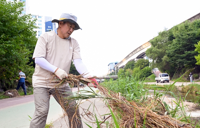 ▲ 김동근 시장이 8월 2일 부용천 일대에서 집중호우로 인해 발생한 부유물 청소 및 환경 정비 활동을.하고 있다.