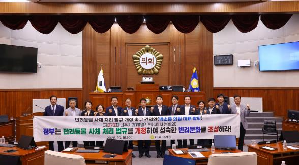 [코리아 이슈저널=홍춘표 기자] 나주시의회는 15일 제273회 임시회 제1차 본회의를 열고 ‘반려동물 사체 처리 법규 개정 촉구 건의안’을 채택했다.