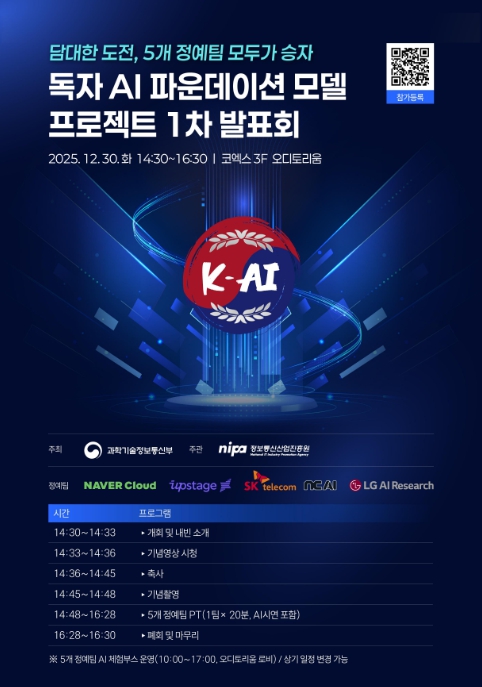 [코리아 이슈저널=최용달 기자] 과학기술정보통신부와 정보통신산업진흥원(원장 박윤규)은 오는 12월 30일 14:30, 코엑스 오디토리움에서, 「독자 AI 파운데이션 모델」 프로젝트 1차 발표회를 개최한다.