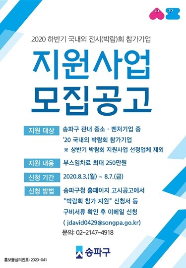 신청대상은 송파구에서 사업자등록 또는 공장등록을 완료한 중소기업으로, 2020년 국내외 박람회에 참가하는 기업이다. 이미 올해 초 박람회에 참가한 후라도 소급 신청이 가능하다.