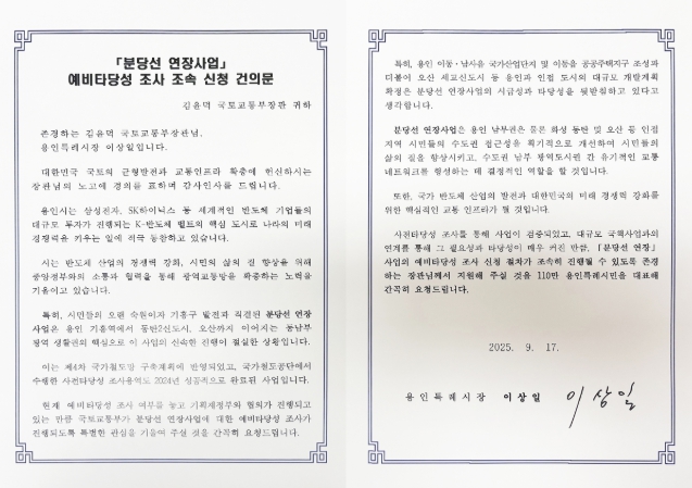 [코리아 이슈저널=홍춘표 기자] 용인특례시는 17일 김윤덕 국토교통부 장관에게 ‘분당선 연장사업’과 ‘경기남부광역철도 사업’의 조속한 추진을 요청하는 이상일 시장의 건의문을 전달했다고 18일 밝혔다.