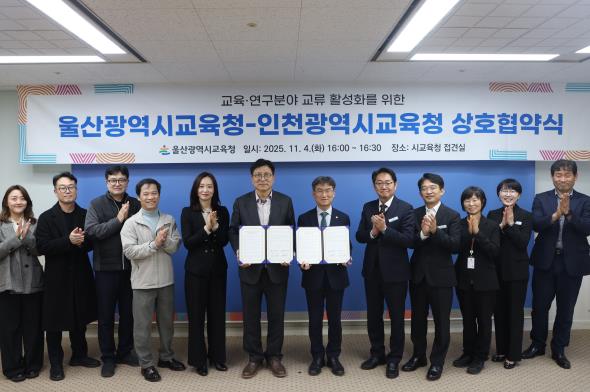 [코리아 이슈저널=김태훈 기자] 울산광역시교육청과 인천광역시교육청이 4일 오후 4시 울산교육청 접견실에서 교육·연구 분야 교류 활성화를 내용으로 하는 업무협약을 했다.