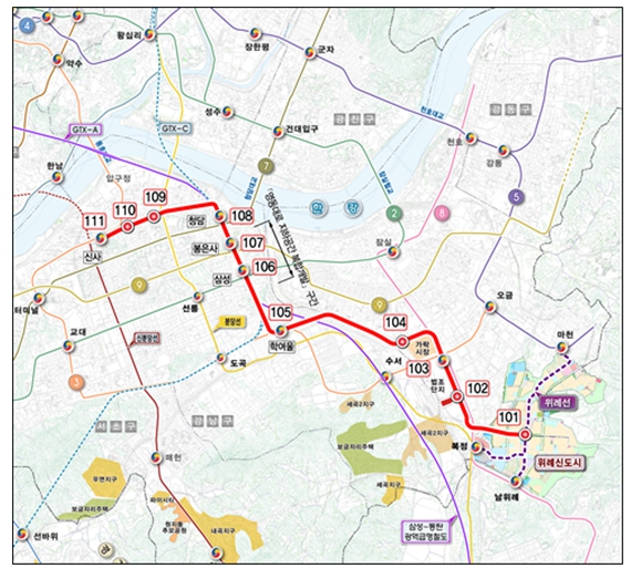 | ▲ 노선도( ※ 정거장 위치 등은 개략적인 것이며 향후 사업계획 수립, 공사 단계 등에서 조정될 수 있음) |