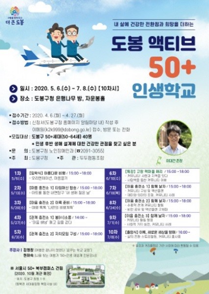 [열린의정뉴스 = 김진성 기자] 서울 도봉구(구청장 이동진)가 100세 시대 새로운 주류로 부상하고 있는 50+세대(50세∼64세)의 인생 2막 활동을 돕기 위한 '50+ 인생 학교 프로그램'을 운영한다고 밝혔다.