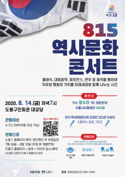 이번 '815 역사문화 콘서트' 공연은 오프라인 무대에 참석하지 못한 구민들을 위해 도봉구청 유튜브, 페이스북을 통해 실시간 라이브 방송한다.