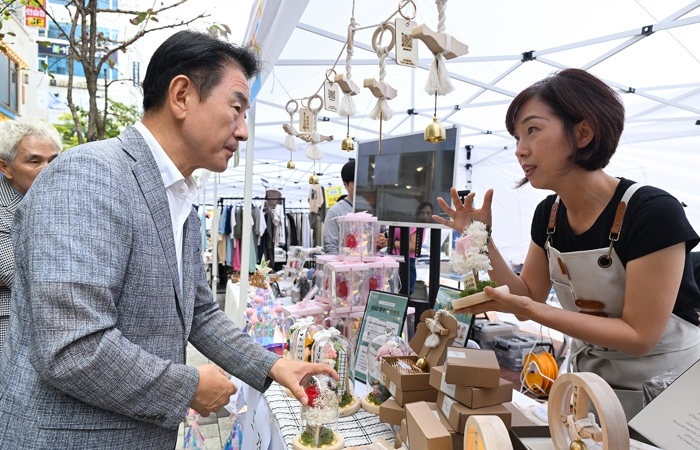 ▲ 김동근 시장이 9월 13일 2025년 우수기업 박람회 및 플리마켓’ 행사 현장에서 제품설명을 듣고 있다.