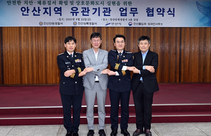 [코리아 이슈저널=홍춘표 기자] 안산시는 지난 22일 오후 단원경찰서에서 외국인 범죄예방 및 지역사회 공헌을 위한 4대 기관 업무협약(MOU)를 체결했다고 23일 밝혔다.