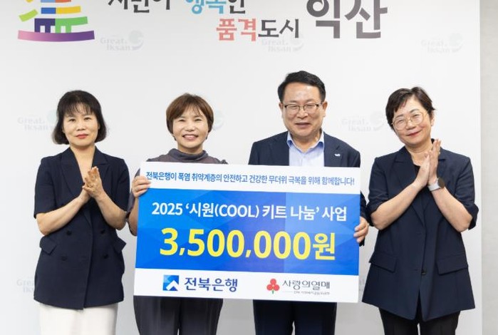 [코리아 이슈저널=김종오 기자] 익산시는 전북은행이 시청을 방문해 지역 저소득 위기가구를 위한 쿨키트 70상자(350만 원 상당)를 기탁했다고 13일 밝혔다.