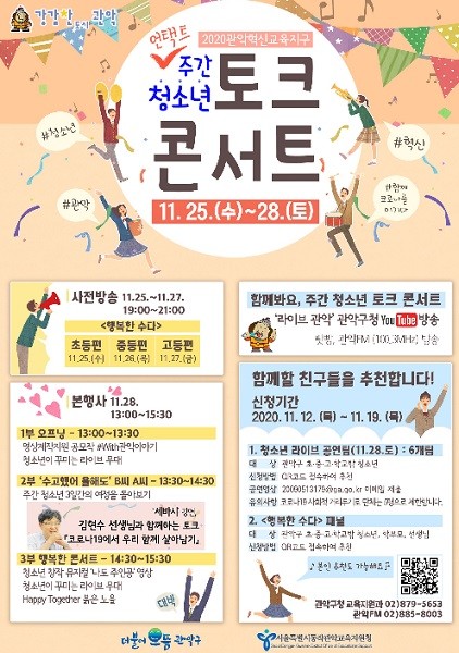 [열린의정뉴스 = 이창희 기자] 관악구(구청장 박준희)가 오는 25일(수) ~ 28일(토)까지 4일간 “2020 관악혁신교육지구 – 언택트 청소년 토크 콘서트“를 개최한다고 밝혔다.
