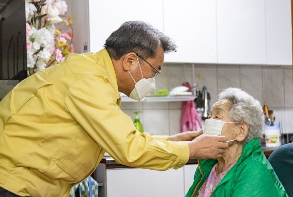 | ▲ 어르신에게 마스크를 씌워드리고 있는 김선갑 광진구청장[출처=광진구청] |