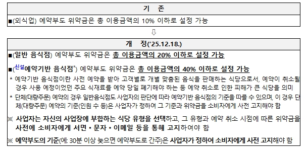 이에 따라 분쟁조정 시 주방 특선(오마카세), 고급 식사(파인다이닝) 등 예약 기반 음식점과 대량 주문(또는 단체 예약)의 경우 총 이용금액의 40% 이하, 일반 음식점은 20% 이하를 기준으로 위약금을 설정할 수 있다.