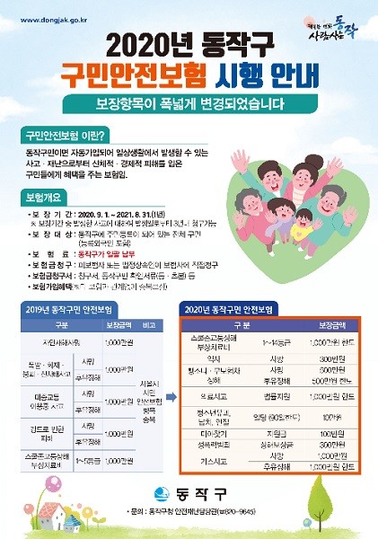 2019년 5월, ‘서울시 동작구 구민안전보험 운영 조례’ 공포에 따라 구는 지난해 9월부터 구민안전보험을 도입해 운영하고 있다.