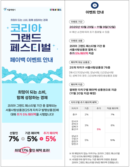 행사 기간(10.29.~11.9.) 25개 자치구 서울사랑상품권으로 결제 시 결제금액 5% 환급
