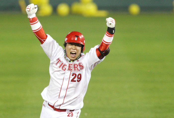 사진은 2009년 10월 24일 잠실야구장에서 열린 한국시리즈(7전 4선승제) 7차전 SK 와이번스와의 경기에서 5-5 동점, 9회말 1사에 끝내기 좌월 솔로 홈런을 친 뒤 팀의 우승을 확정하며 기뻐하는 나지완. 2022.9.1 [연합뉴스 자료사진]