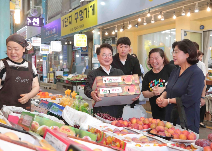 육동한 시장은 28일 퇴계동 행정복지센터에서 윤일숙 여사와 함께 소비쿠폰을 발급받고 후평시장에서 삼겹살, 과일, 양말 등 72만원 상당의 기부 물품을 직접 장만해 애민보육원에 전달했다.