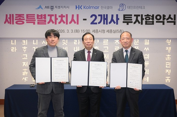 [코리아 이슈저널=최용달 기자] 세종특별자치시가 3일 시청 세종실에서 한국콜마㈜, ㈜대인프린테크와 관내 산업단지 내 공장 신설 및 전면 이전을 위한 1,858억 원 규모의 투자협약(MOU)을 체결했다.