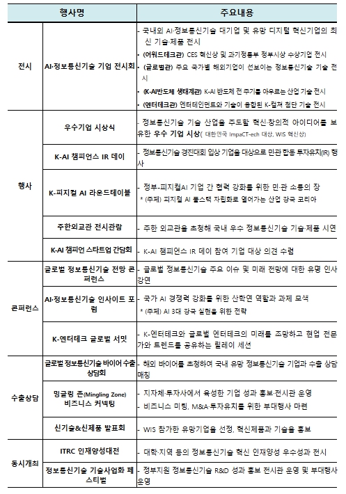 또한, 올해 처음으로 다양한 전문 프로그램도 운영된다. ‘인공지능·정보통신기술 통찰력 토론회(인사이트 포럼)’에서는 인공지능 3대 강국 도약을 위한 정책·기술 전략을 산·학·연 전문가들과 함께 논의하고, ‘한국형 물리적 인공지능 원탁회의(K-피지컬 AI 라운드테이블)’에서는 정부와 기업이 참여하여 산업 현장 중심의 물리적 인공지능(피지컬 AI) 기술 발전 방향과 협력 방안을 모색한다. 아울러, ‘한국형 융합 콘텐츠 기술 세계 정상회의(K-엔터테크 글로벌 서밋)’에서는 K-콘텐츠와 인공지능 기술의 융합 사례를 기반으로 세계 시장 진출 전략과 사업 모델을 공유할 예정이다.