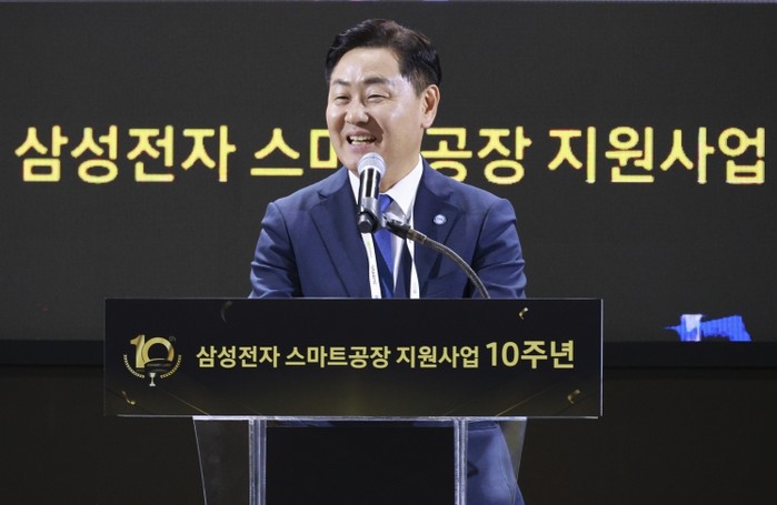 | ▲ 21일 서울 코엑스에서 '2025 스마트비즈엑스포' 행사 일환으로 열린 삼성전자 스마트공장 지원사업 10주년 기념식에 김관영 도지사 |