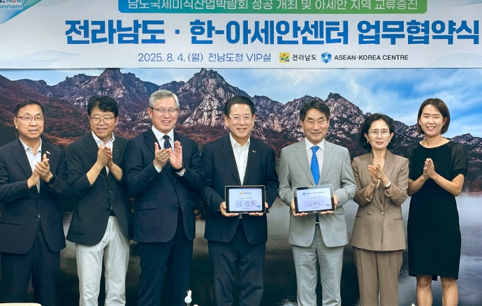 [코리아 이슈저널=김종오 기자] 전라남도는 4일 도청 접견실에서 한-아세안센터와 함께 2025 남도국제미식산업박람회의 성공 개최와 아세안 지역 교류 증진을 위한 업무협약(MOU)을 했다.