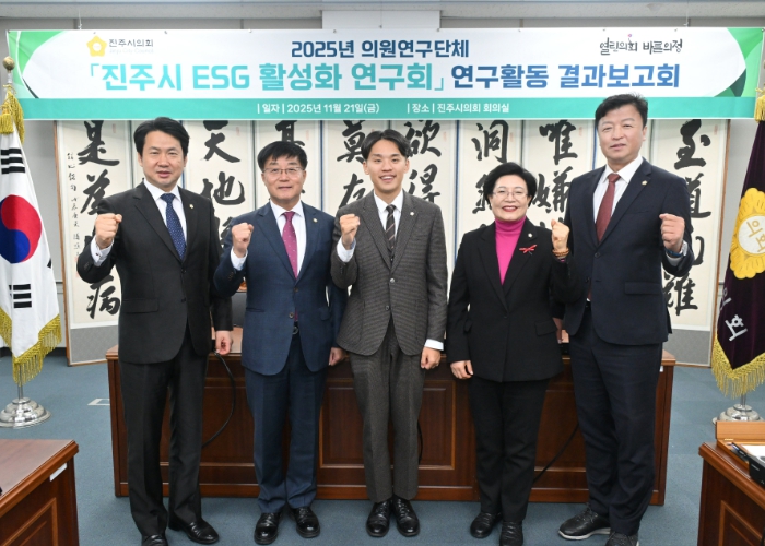 [코리아 이슈저널=김태훈 기자] 진주시의회 의원 연구단체 ‘진주시 ESG 활성화 연구회’는 21일 올해 연구활동을 마감하는 결과보고회를 열고, 연간 추진 성과와 향후 정책 제언을 공유했다고 밝혔다.