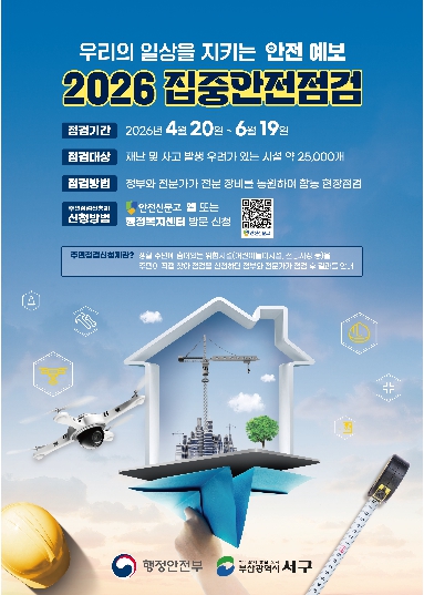 [코리아 이슈저널=김태훈 기자] 서구는 재난과 안전사고를 예방하기 위해 2026년 집중안전점검을 실시한다. 집중안전점검은 재난 발생 가능성이 있는 시설을 사전에 점검하여 위험요인을 발굴하고 개선하는 범정부 안전관리 정책으로, 국민의 생명과 재산을 보호하기 위해 매년 추진된다.