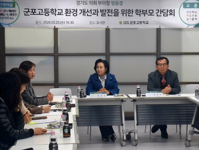 [코리아 이슈저널=홍춘표 기자] 경기도의회 정윤경 부의장(더불어민주당, 군포1)은 2월 25일 군포고등학교 도서관에서 교직원 및 학부모들과 ‘학교 환경 개선과 발전을 위한 학부모 간담회’를 개최하고 학교 현안 전반에 대해 의견을 나눴다.