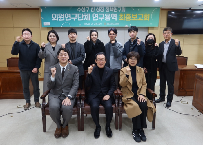 [코리아 이슈저널=김태훈 기자] 수성구의회 의원연구단체 ‘수성구 신 성장 정책연구회’는 지난 25일 의회 2층 회의실에서 '지속 가능한 발전을 위한 미래 신성장 동력 발굴' 연구용역 최종보고회를 개최했다.