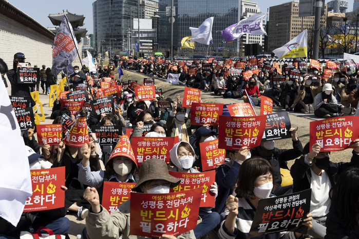 [열린의정뉴스 = 김윤영 기자] 7일 오후 서울 고궁박물관 인근에서 열린 성평등 부처 확대 강화 촉구 기자회견에서 여성폭력피해자지원현장단체연대 회원들이 관련 구호를 외치고 있다. 2022.4.7