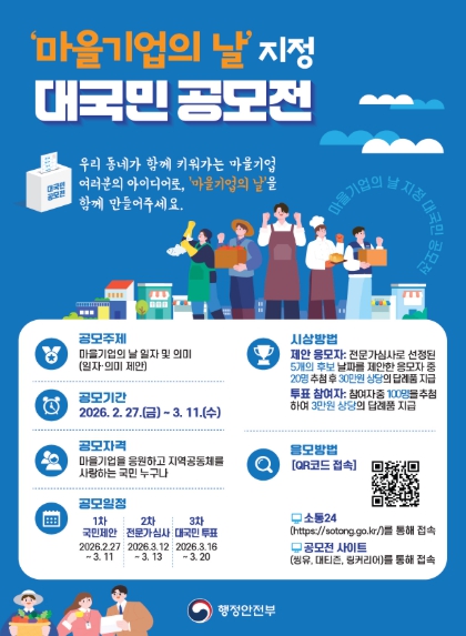 [코리아 이슈저널=최준석 기자] 행정안전부는 ‘마을기업’에 대한 국민의 이해를 높이고 마을기업 활동을 활성화하기 위해 법정기념일인 ‘마을기업의 날’의 날짜와 의미를 국민이 직접 정하는 대국민 공모를 진행한다고 밝혔다.