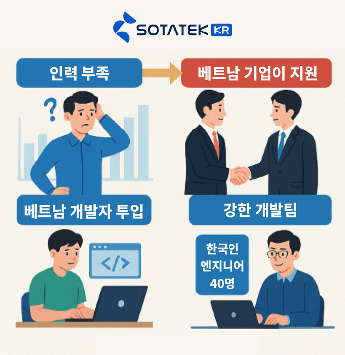 그 중 하나인 소타텍 코리아(SotaTek Korea)는 하노이에 본사를 둔 SotaTek의 한국 지사로, 한국에서의 기술 파트너로서 강한 입지를 다지고 있다. 소타텍 코리아는 베트남에서 고품질의 소프트웨어 개발 서비스를 제공하는 것 외에도, 웹 백엔드, 앱, 기업 시스템 및 대형 플랫폼 유지보수 등의 분야에서 경험이 풍부한 40명 이상의 한국인 엔지니어 및 프로젝트 매니저 팀을 보유하고 있다. 이는 서울 내에서 현지화된 기술팀을 갖춘 소수의 IT 기업 중 하나로, 한국 고객들과의 원활한 소통과 품질 보장을 보장한다.