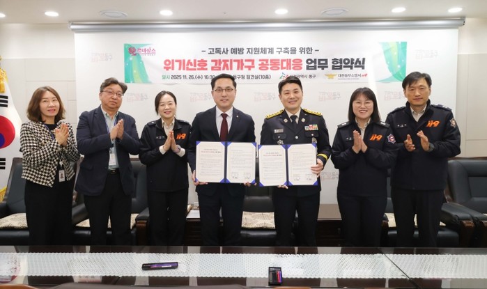 [코리아 이슈저널=홍종수 기자] 대전 동구는 26일 구청장 접견실에서 대전 동부소방서(서장 이준서)와 ‘위기신호 감지가구 공동대응’ 업무협약을 체결했다고 밝혔다.