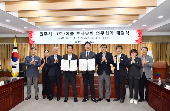 [코리아 이슈저널=최제구 기자] 원주시는 10월 1일 오후 2시, 시청 7층 투자상담실에서 ㈜이솔(대표 김병국)과 투자유치 협약(MOU)을 체결했다. 이번 협약은 총 505억 원 규모의 투자로, 부론일반산업단지에 소형 방사광가속기와 첨단 EUV 반도체 검사장비 연구·생산시설을 구축하는 사업이다. EUV(Extreme Ultra-Violet)는 반도체 초미세 공정(7nm 이하)에 필수적인 광원이다.