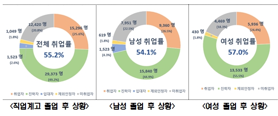 지역별로는 대구(67.8%), 경북(63.9%), 대전(60.7%), 울산(60.3%), 세종(59.8%), 충남(58.2%), 경남(55.9%), 인천(55.7%), 충북(55.4%), 부산(55.3%) 10개 시도의 경우 취업률이 전체 취업률 평균(55.2%)보다 높았다.