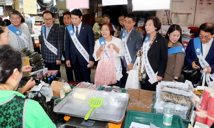 남관우 의장과 김원주 운영위원장, 최용철 행정위원장, 김윤철 복지환경위원장, 박혜숙 문화경제위원장을 비롯한 의원들과 의회사무국 직원 등 20여 명은 온누리상품권으로 추석 제수용품을 구매하고 상인들의 애로사항을 청취했다.
