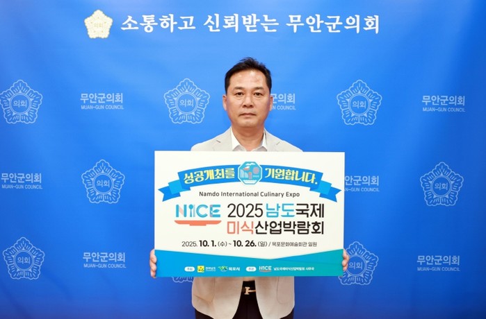 [코리아 이슈저널=홍춘표 기자] 무안군의회 이호성 의장은 김산 무안군수와 박종대 영암군의회 의장의 지명을 받아 오는 10월 1일부터 26일까지 목포문화예술회관 일원에서 열리는 ‘2025 남도국제미식산업박람회’ 성공을 기원하는 릴레이 응원 캠페인에 동참했다.