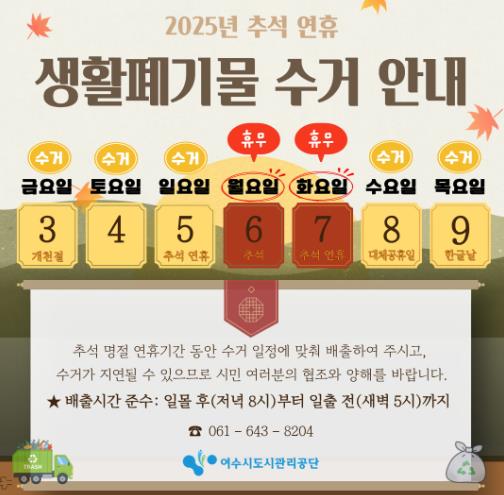 특히 6일과 7일은 연휴로 인해 생활폐기물 정기 수거가 잠시 중단되지만, 비상근무 인력을 투입해 시민 불편을 최소화하겠다는 계획이다.