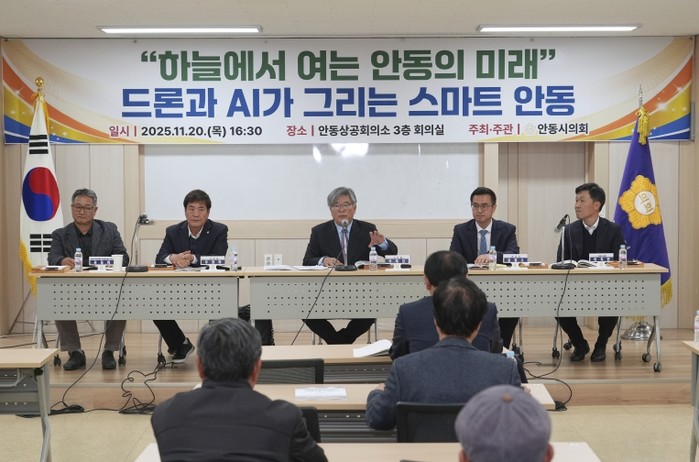 [코리아 이슈저널=김태훈 기자] 안동시의회는 11월 20일 16시, 안동 상공회의소 3층 회의실에서“하늘에서 여는 안동의 미래, 드론과 AI가 그리는 스마트 안동”를 주제로 정책토론회를 개최했다.