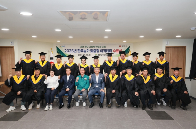 [코리아 이슈저널=김태훈 기자] 예천군은 30일 오후 4시, 단샘어울림센터 회의실에서 한우농가 30명이 참석한 가운데 2025년 ‘예천한우 맞춤형 아카데미 수료식’을 개최했다. 이번 수료식에는 김학동 군수도 함께해 수료자들을 격려했다.