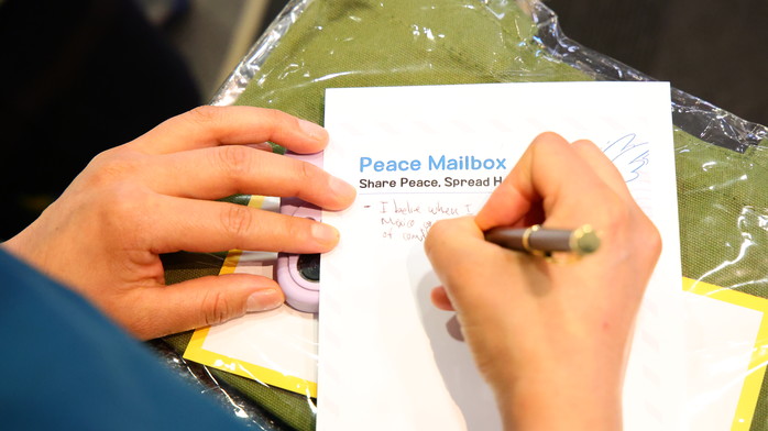 | ▲PLACE 캠페인을 체험하며 학생들이 자신의 평화 실천 이야기를 기록하고 있다. |