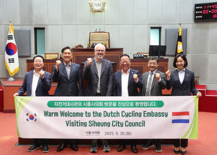 [코리아 이슈저널=홍춘표 기자] 시흥시의회 도시환경위원회가 9월 30일 의회청사 소담뜰에서 네덜란드 자전거대사관(Dutch Cycling Embassy, DCE)을 초청해 간담회를 열고, 시흥시 자전거 정책 발전 방향과 친환경 교통 시스템 구축 방안에 대해 논의했다.