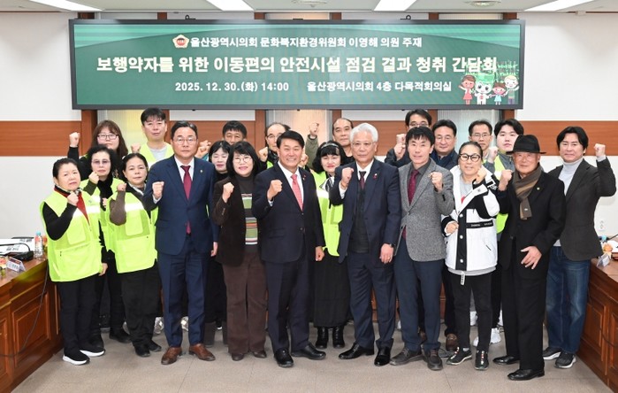 [코리아 이슈저널=홍춘표 기자] 울산광역시의회 문화복지환경위원회 이영해 의원은 30일 오후 2시 4층 다목적회의실에서 '보행약자를 위한 이동편의 안전시설 점검 결과 청취 간담회'를 개최하고, 보행약자의 안전한 이동환경 조성을 위한 개선방안을 논의했다.