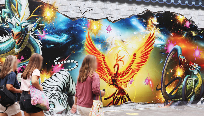 [열린의정뉴스 = 김윤영 기자] 18일 오후 경기도 평택시 팽성읍 안정리 로데오거리에서 열리고 있는 히어로 아트쇼 '코로나를 물리치는 우리나라 수호신들'에 청룡, 백호, 주작, 현무가 코로나19 바이러스를 물리치는 모습을 담은 트릭아트 포토존이 설치되어 있다. 2022.7.18